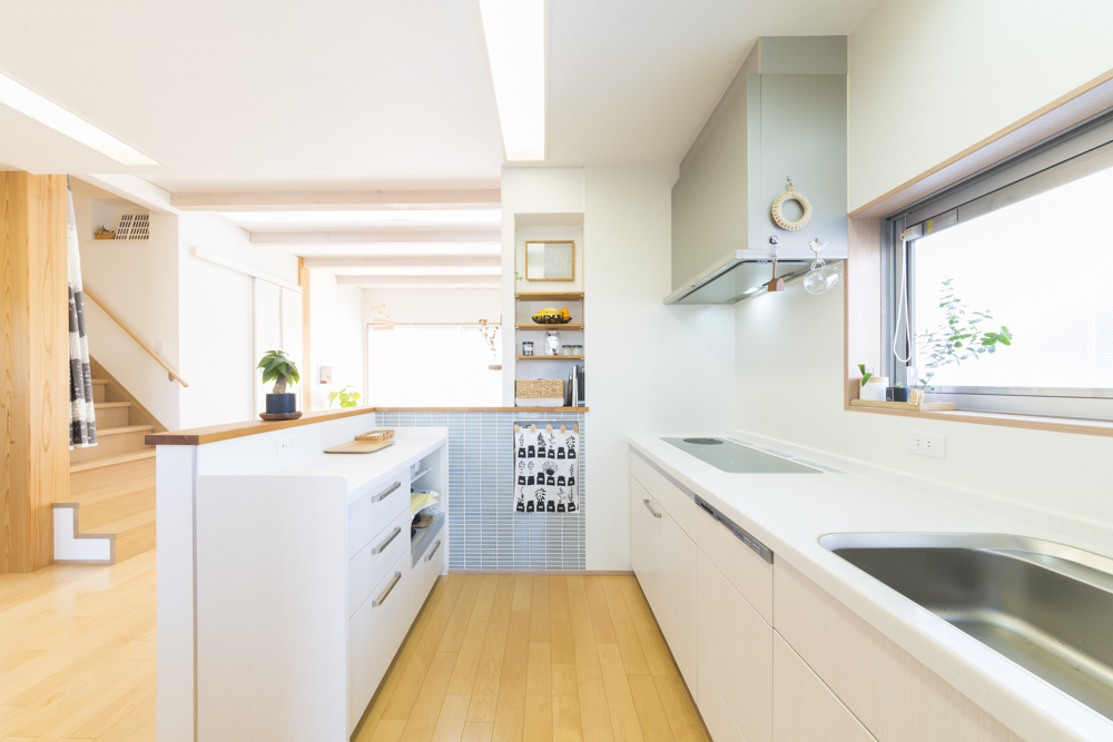 - キッチンですね。メイクデイズさんが、キッチンの窓の中にブラインドを入れるように提案してくれました。室内に光を取り入れたいとき、プライバシーを確保したいときなど、状況に合わせて調整できるのでとても気に入っています。